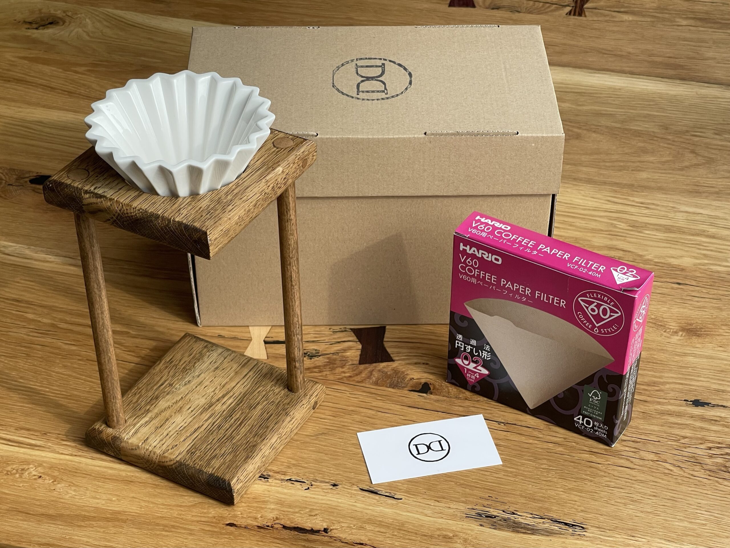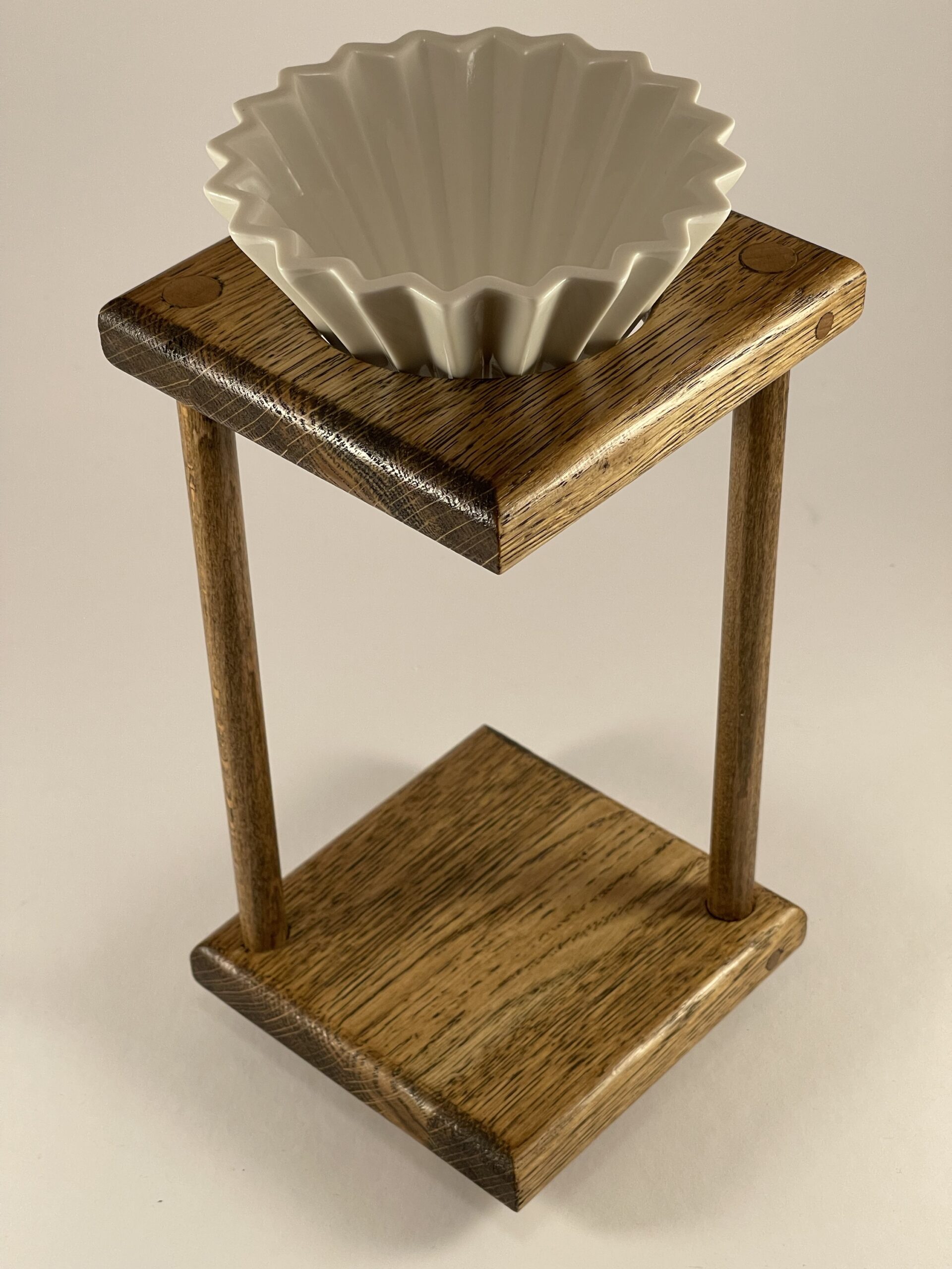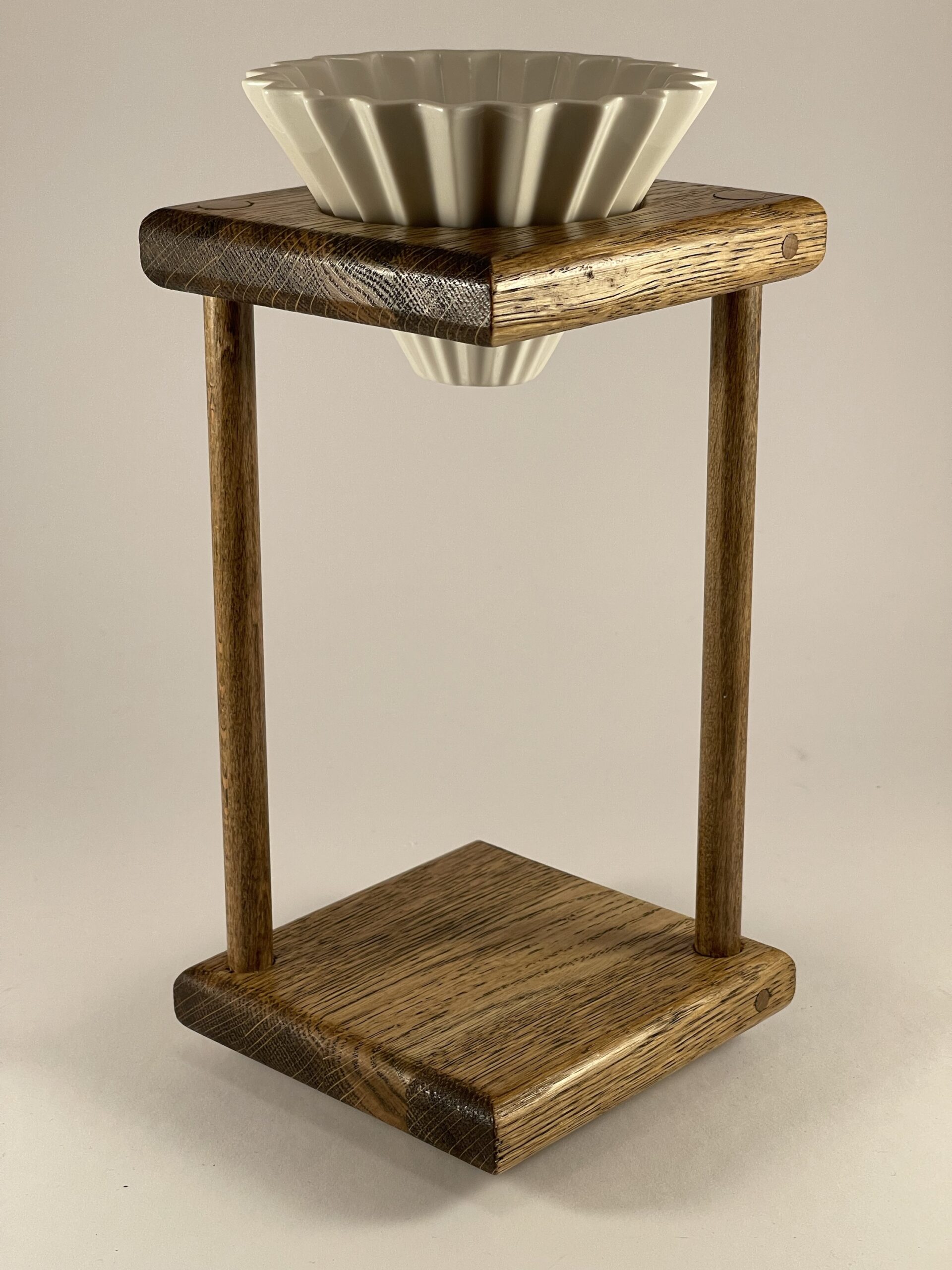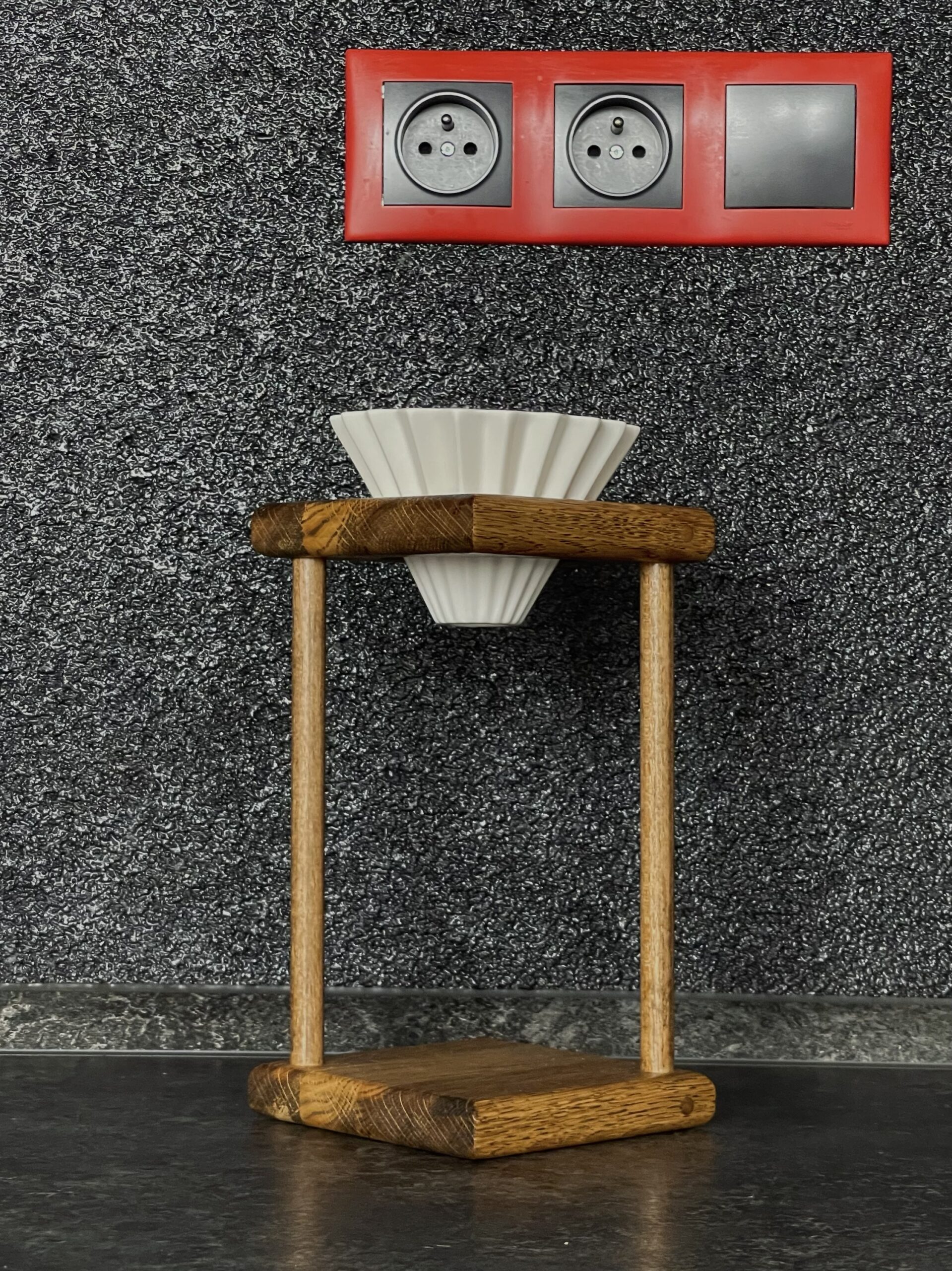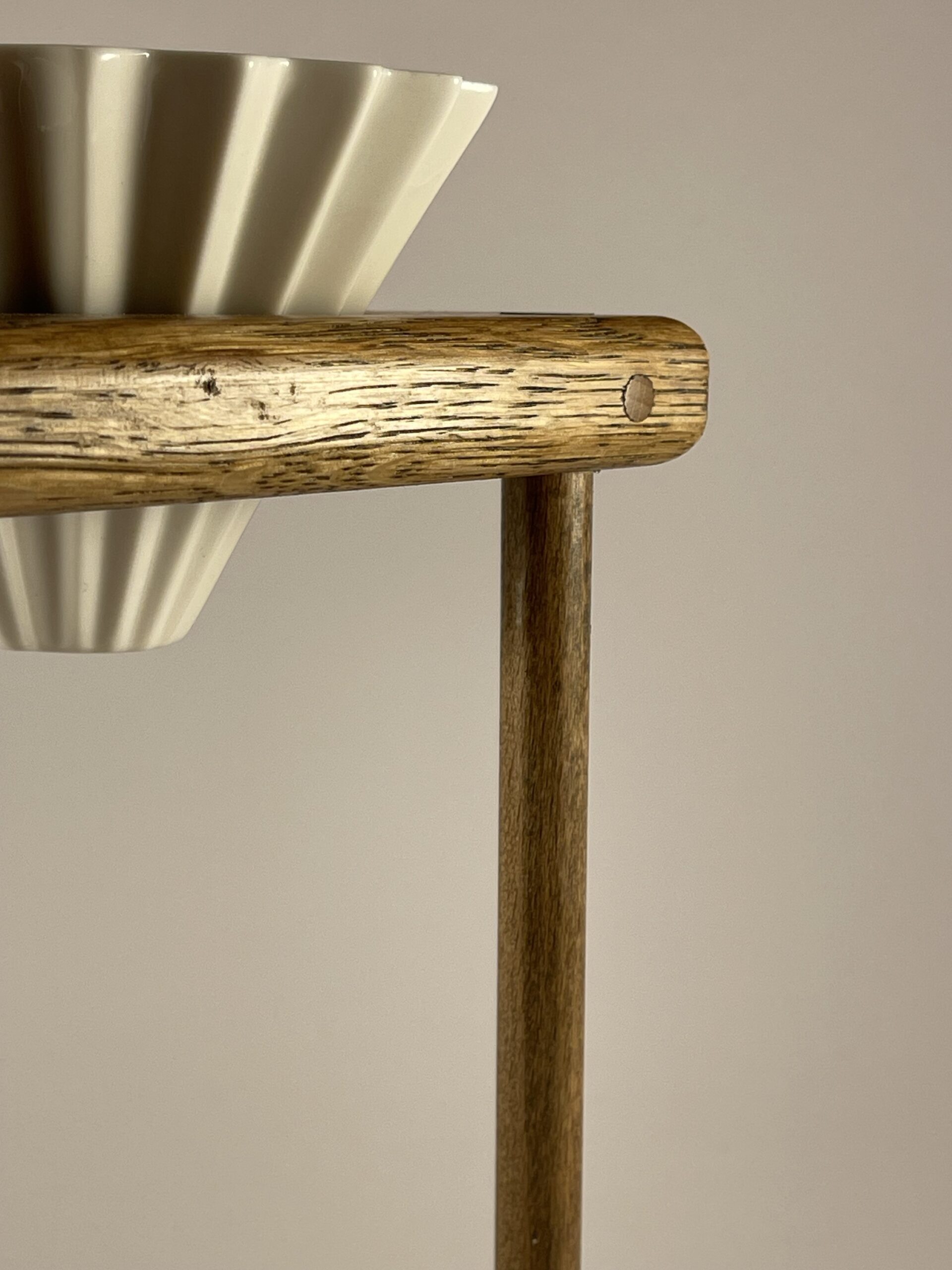 Ručně vyrobený dubový stojánek s porcelánovým dripperem pro přípravu filtrované kávy.